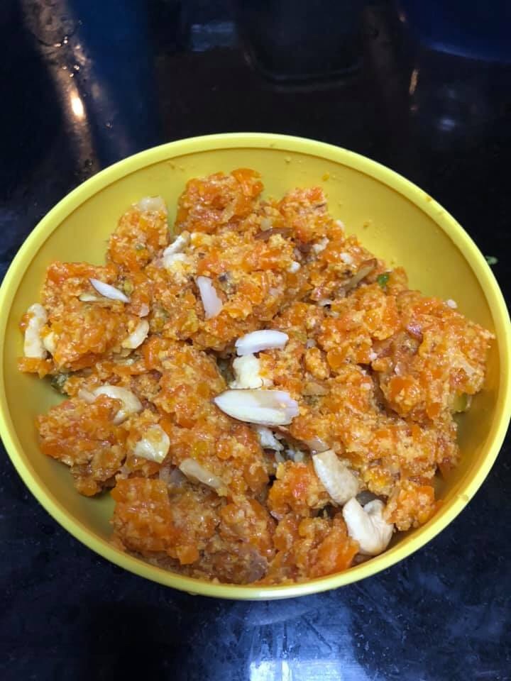 Methods- grate carrot and cook for 5min then add milk and boil it then let it simmer n cook until milk dries, add sugar cook for 2-3 min, add khoya mix well add ghee mix well cook for 5min then add nutmeg n elaichi powder mix n add all dry fruits as per ur choice I used cut/ sliced almond, cashew n pistachio mix well